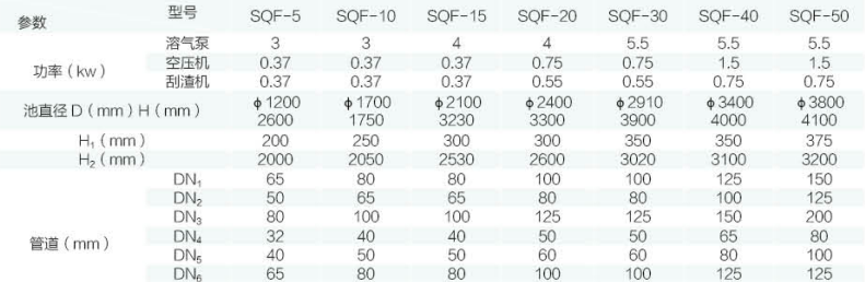 工作原理:溶氣水從池底部進(jìn)入,污水從上部通入池內(nèi)的分離罩中,兩者完 全混合,溶氣水經(jīng)釋放器形成大量的微小氣泡,在氣泡的粘附裹 攜下,與懸浮物形成比重小于水中團(tuán)體,迅速浮出水面,形成浮 渣,經(jīng)撇渣裝置刮除后,流入渣槽中,排出池外。