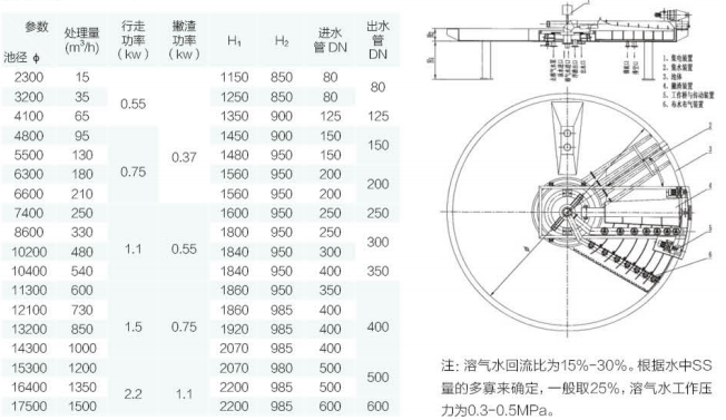 4、采用溶氣水與原水完全分開(kāi)布水的方式,配專用釋放器。處 理效果好,SS 去除率高達(dá)90%以上,出渣含固率可達(dá)3-4%。 5、自動(dòng)化程度高,管理方便,運(yùn)行可靠。