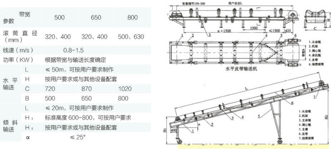 用途:帶式輸送機(jī)主要用來(lái)輸送顆?;蚍勰罟腆w,用于環(huán)保上主要用于輸送柵渣,脫水后的泥餅、泥沙等。