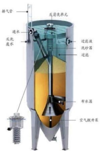 工作原理:活性砂過濾器基于逆流原理,待處理的原水通過進(jìn)水管進(jìn)入過濾器內(nèi)部,經(jīng)底部布水器均勻分配后向上逆流通過濾床,過濾后的濾液在過濾器頂部匯集后溢流排出過濾器系統(tǒng)。在空壓機(jī)的作用下,空氣提升泵將過濾器底層被污染的臟砂提升至過濾器頂部的洗砂器中,通過水流的紊流作用將砂表面的污染物分離出。清洗后的凈砂利用自重返回到砂床中,而清洗砂所產(chǎn)生的污水從過濾器的排污口排出。