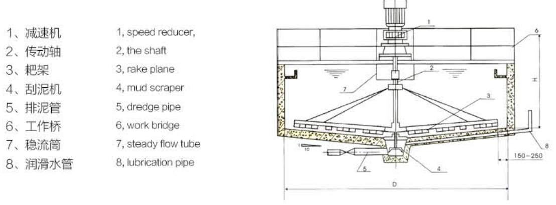 ?GZX型中心傳動(dòng)刮吸泥機(jī)廣泛用于給水工程中的沉淀池排泥,整機(jī)載荷都作用在工作橋中心。污水經(jīng)中心穩(wěn)流筒布水后流向周邊溢水槽,隨著流速的降低,污水中的懸浮物被分離而沉降于池底,由刮板將沉淀的污泥刮集到中心集泥槽中,靠靜水壓力將其從污泥管排出。